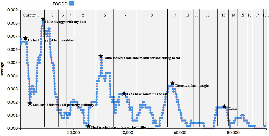 The food words generally decrease over the course of the book. We predicted that. If we read the dip in Chapter 1 as an abundance of common food words and the spike in chapter 6 as a spike in thinking about food they weren’t getting, it’s a trend.