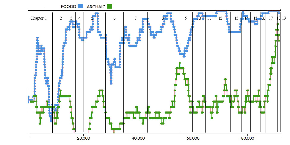 We could, if we squint hard, call those matching trajectories. If you had asked me last week if I had a prediction about this, I would probably have said, “Sure, as food and comfort go down across the book, archaism and lofty things increase, I’ll put a nickel on that.” What piques my curiosity this morning? Where and why these lines diverge from the predicted pattern.