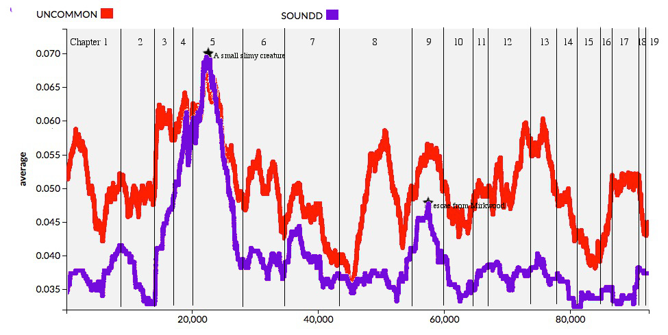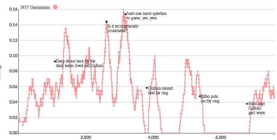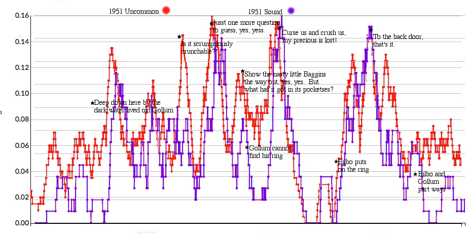 footnote: alert Word Fans who hang on every graph will realize that this is a new version of the Sound graph made since the decision to count the names Gollum and Roäc and Carc as sound play words. The scale goes up to 0.03 now to contain that Chapter 5 peak and even the Chapter 9 peak looks rather puny in comparison. For comparison, the overall uncommon words graph scale reaches to 0.070. See the posts tagged 1937 to see with smaller windows even stronger influence of sound on Chapter 5.