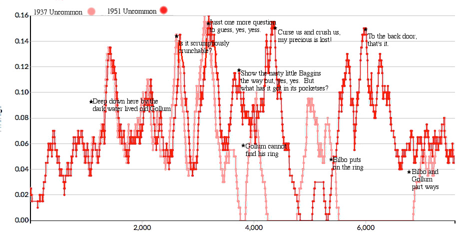 The exciting news for us is that we can measure exactly what Tolkien changed between his two editions of Chapter 5, and we know exactly why he made those changes. We’ve proven that the new paragraphs were full of uncommon words, we’ve proven that those new paragraphs were full of sound words. I believe we can conclude positively that the sounds of stagnant water and deep-throated swallowing and Gollum words and a preponderance of initial-S words are Tolkien’s specific instruments for creating the tone of decay and corruption which emanates from The Ring. I would be excited to carry this idea forward to examine the ring-influenced portions of The Lord of the Rings.