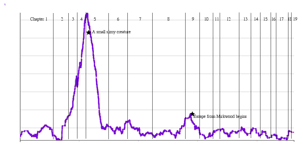 To make the graph between peaks fall, it takes both hunger and distraction from food words. It takes pleasant distraction in Chapter 3, fright and fight and flight in Chapter 4, focus and wits and luck in Chapter 5. But it takes more. As Chapter 3 begins, the food words plummet while the uncommon words soar steeply. It’s not a slow process but a liminal instant.