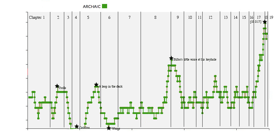 Indeed, Bilbo – the author and therefore narrator of the story – has not mentioned uncommon food at all since “bacon” at the end of Chapter 16, even in his after-battle recovery. At the very end of the story – do you see that tiny uptick in the blue graph? – the kettle sings and the tobacco jar is shared. Bilbo is different – changed, but not broken. The food words will return, all the more savory.